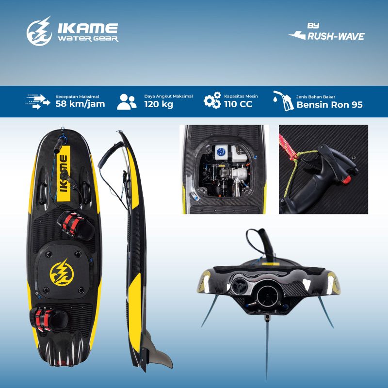 Gasoline Surfboard Ikame Water Gear adalah jetsurf berbahan bakar bensin dengan tenaga besar dan kontrol elektronik terbaru. Cocok buat kamu yang cari pengalaman ekstrem di air dengan kecepatan tinggi dan mesin yang agresif. Mesin 2-tak 110cc ini ringan, cepat, dan responsif—tapi tetap mudah dioperasikan karena pakai tombol starter elektrik